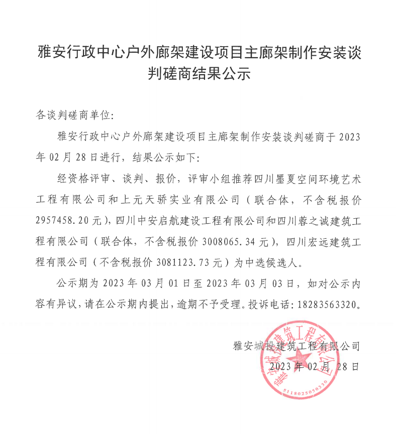 雅安行政中心戶外廊架建設(shè)項(xiàng)目主廊架制作安裝談判磋商結(jié)果公示