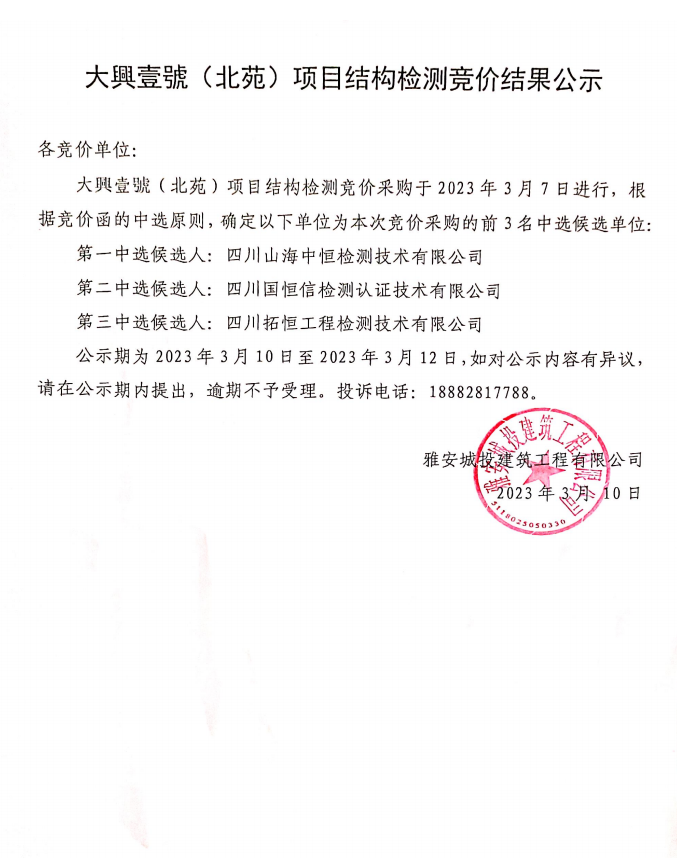 大興壹號(hào)(北苑)項(xiàng)目結(jié)構(gòu)檢測(cè)競(jìng)價(jià)結(jié)果公示