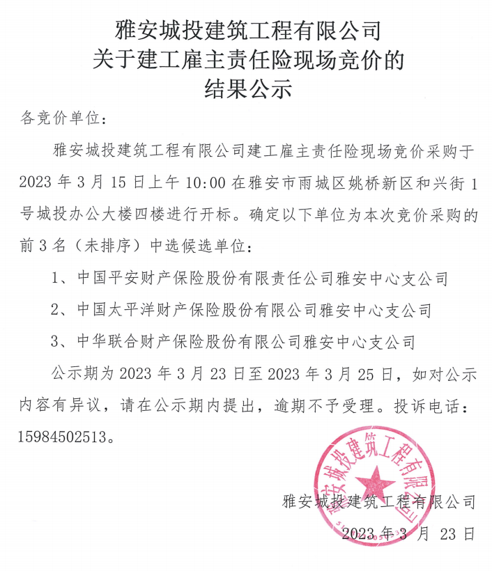 雅安城投建筑工程有限公司關(guān)于建工雇主責(zé)任險(xiǎn)現(xiàn)場(chǎng)競(jìng)價(jià)的結(jié)果公示