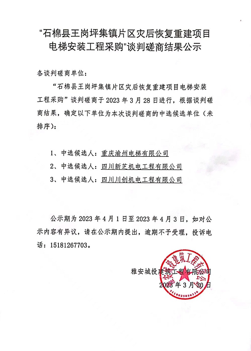 “石棉縣王崗坪集鎮(zhèn)片區(qū)災(zāi)后恢復(fù)重建項(xiàng)目電梯安裝工程采購(gòu)”談判磋商結(jié)果公示