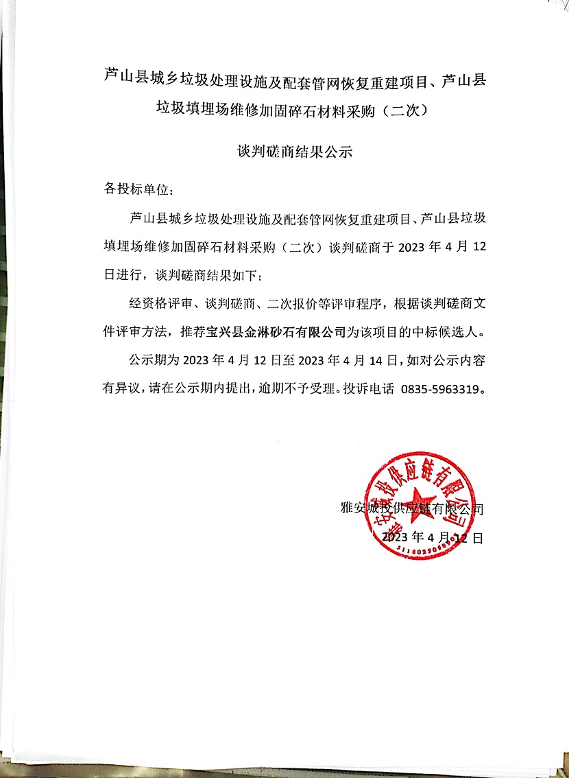 蘆山縣城鄉(xiāng)垃圾處理設(shè)施及配套管網(wǎng)恢復(fù)重建項(xiàng)目、蘆山縣垃圾填埋場(chǎng)維修加固碎石材料采購(二次)談判磋商結(jié)果公示