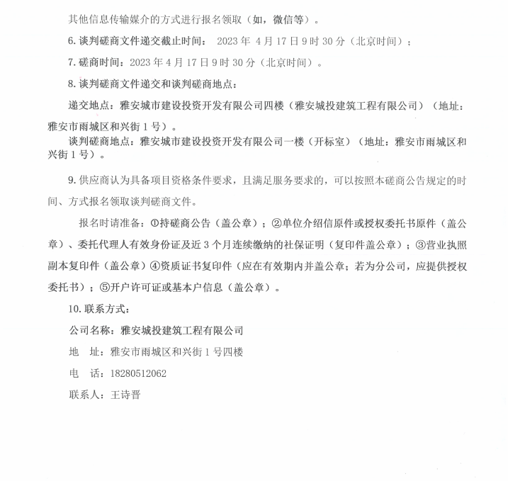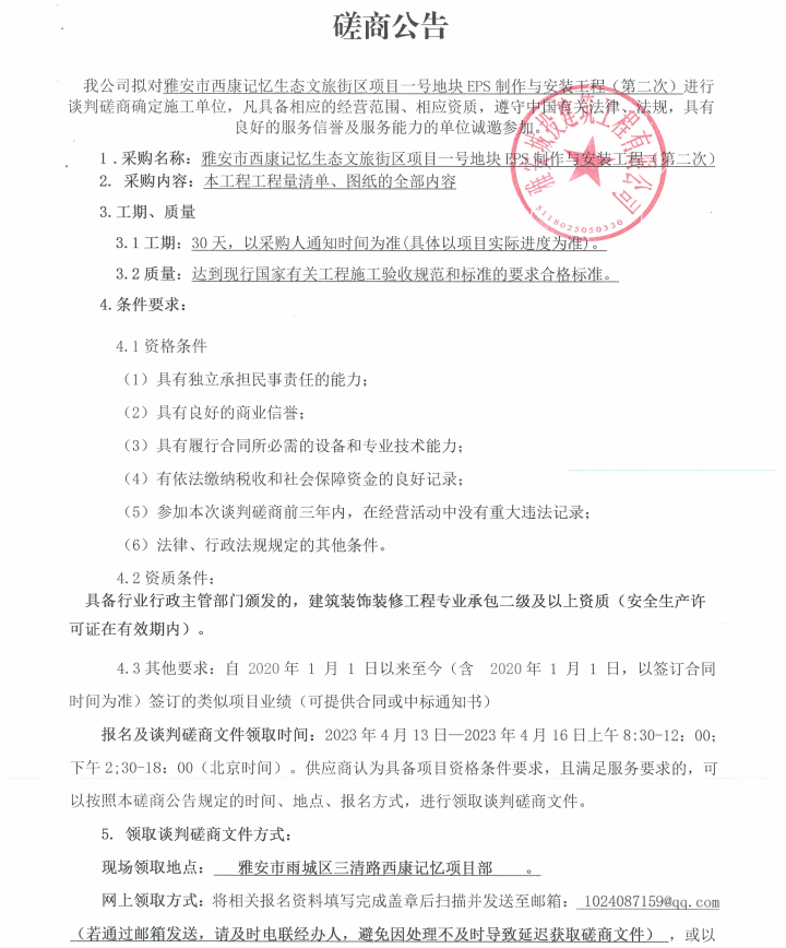 雅安市西康記憶生態(tài)文旅街區(qū)項(xiàng)目一號地塊項(xiàng)目EPS制作與安裝工程(第二次)采購談判磋商公告