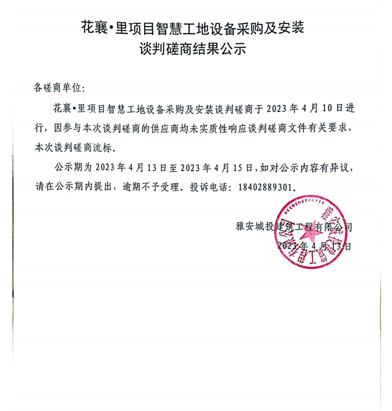 花襄·里項目智慧工地設(shè)采購備及安裝談判磋商結(jié)果公示