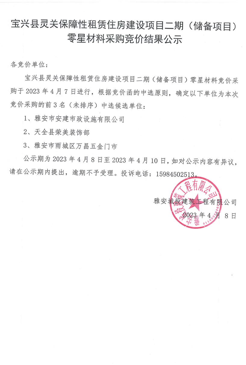 寶興縣靈關(guān)保障性租賃住房建設(shè)項(xiàng)目二期(儲備項(xiàng)目)零星材料采購競價結(jié)果公示