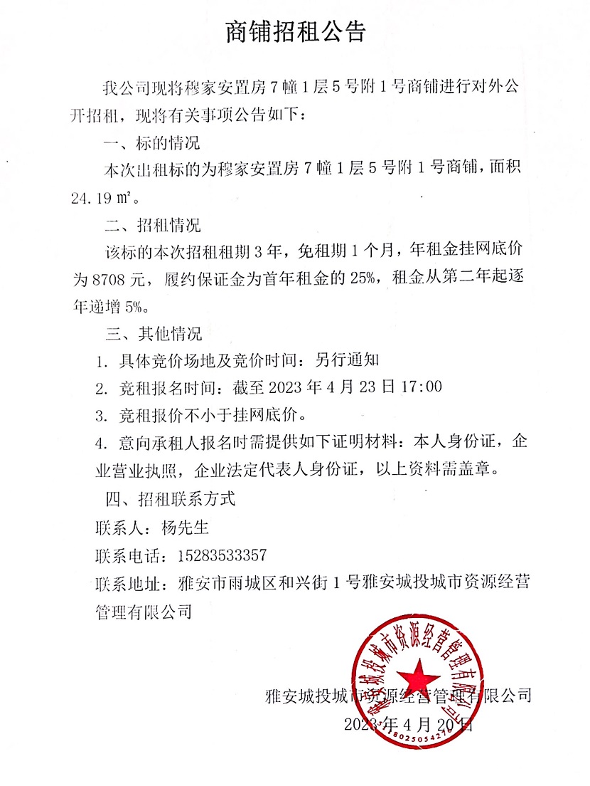 穆家安置房7幢1層5號附1號商鋪招租公告
