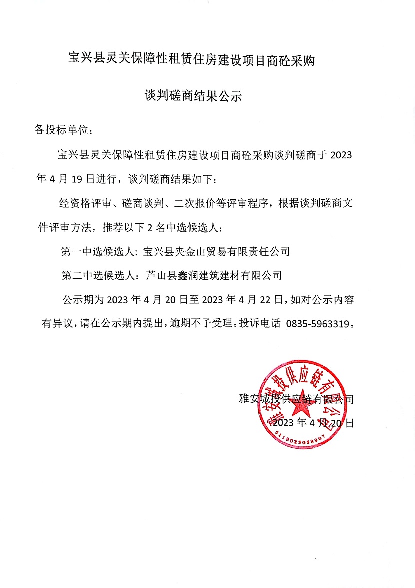 寶興縣靈關(guān)保障性租賃住房建設(shè)項(xiàng)目商砼采購談判磋商結(jié)果公示