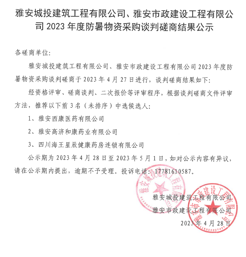 雅安城投建筑工程有限公司、雅安市政建設工程有限公司2023年度防暑物資采購談判磋商結(jié)果公示