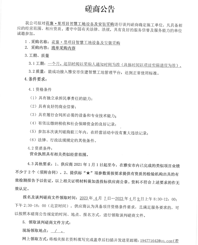 花襄·里項目智慧工地設(shè)備及安裝采購磋商公告