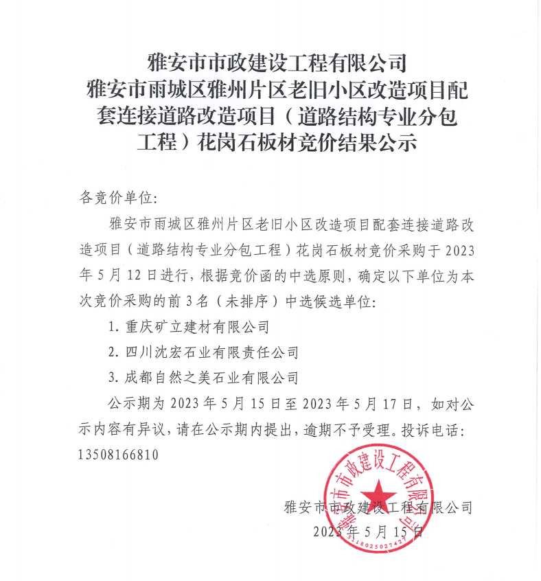 雅安市市政建設(shè)工程有限公司雅安市雨城區(qū)雅州片區(qū)老舊小區(qū)改造項目配套連接道路改造項目(道路結(jié)構(gòu)專業(yè)分包工程)花崗石板材競價結(jié)果公示