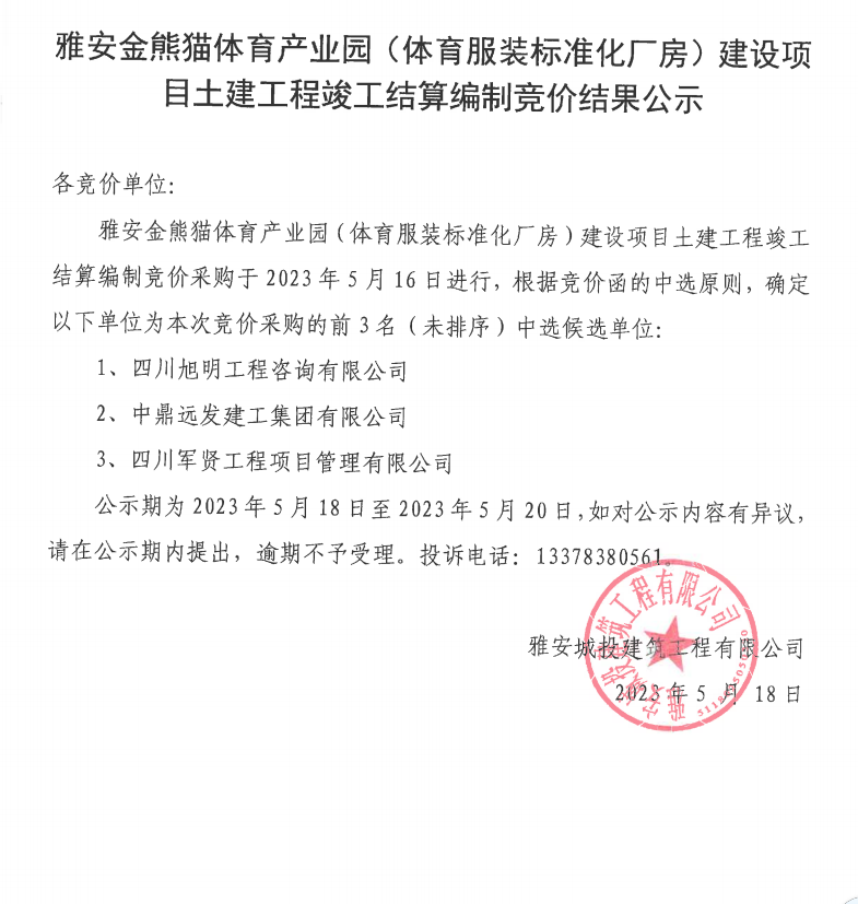 雅安金熊貓體育產(chǎn)業(yè)園(體育服裝標(biāo)準(zhǔn)化廠房)建設(shè)項目土建工程竣工結(jié)算編制競價結(jié)果公示
