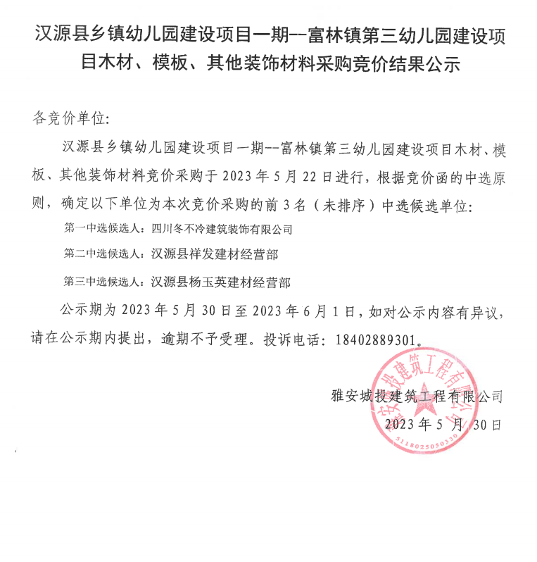 漢源縣鄉(xiāng)鎮(zhèn)幼兒園建設(shè)項(xiàng)目一期--富林鎮(zhèn)第三幼兒園建設(shè)項(xiàng)目木材、模板、其他裝飾材料采購(gòu)競(jìng)價(jià)結(jié)果公示
