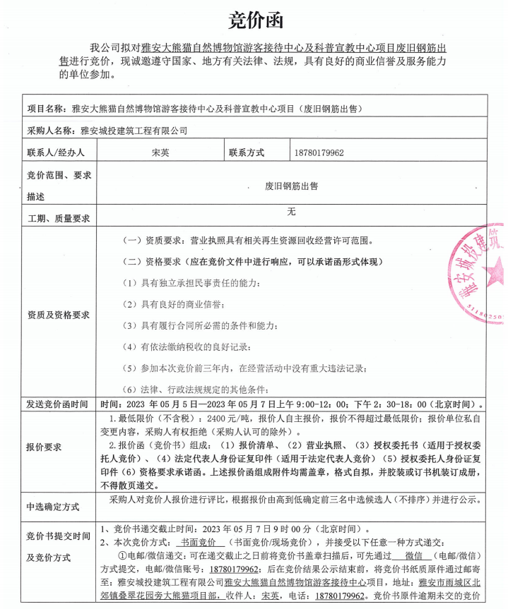 雅安大熊貓自然博物館游客接待中心及科普宣教中心項目廢舊鋼筋出售競價公告