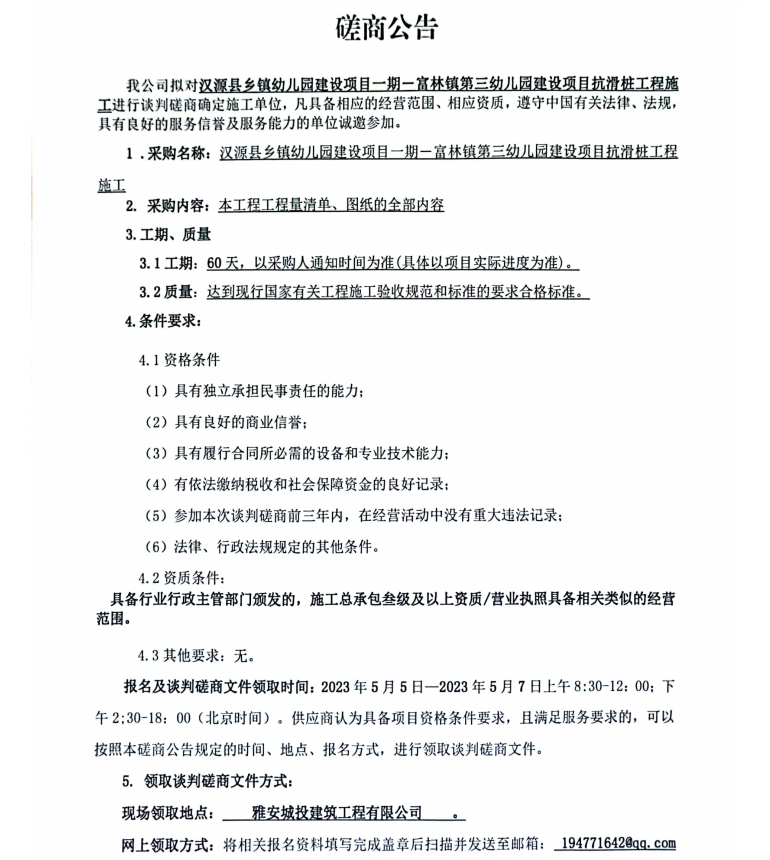 漢源縣鄉(xiāng)鎮(zhèn)幼兒園建設(shè)項目一期一富林鎮(zhèn)第三幼兒園建設(shè)項目抗滑樁工程施工談判磋商公告