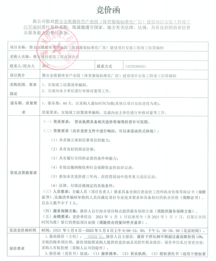 雅安金熊貓體育產(chǎn)業(yè)園(體育服裝標準化廠房)建設項目安裝工程竣工結算編制競價公告