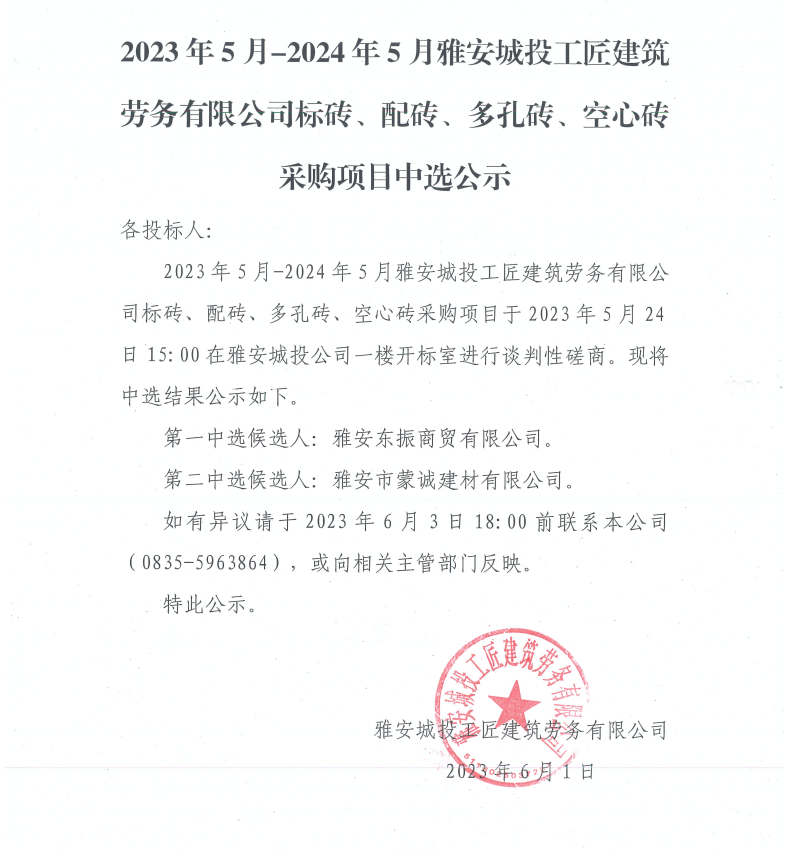 2023年5月-2024年5月雅安城投工匠建筑勞務(wù)有限公司標磚、配磚、多孔磚、空心磚采購項目中選公示
