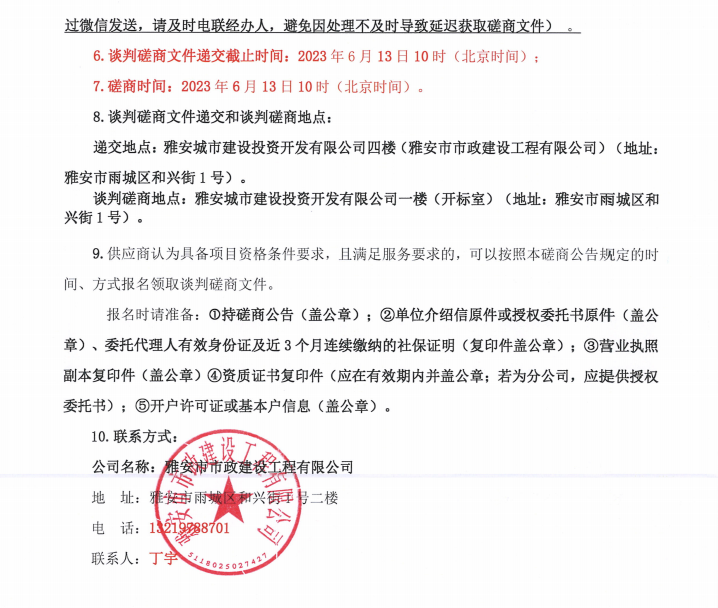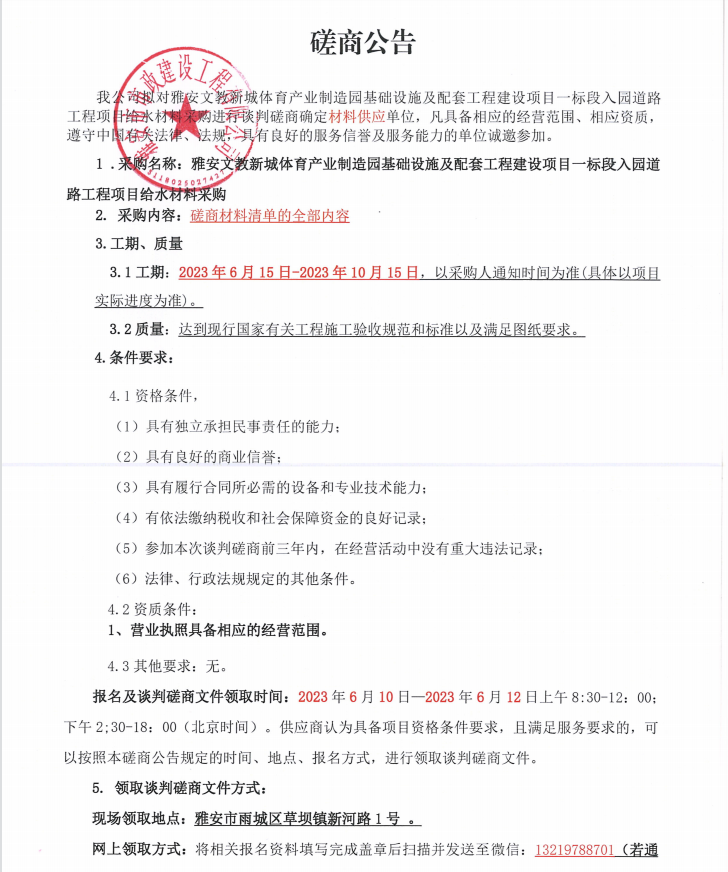 雅安文教新城體育產業(yè)制造園基礎設施及配套工程建設項目一標段入園道路工程項目給水材料采購談判磋商公告