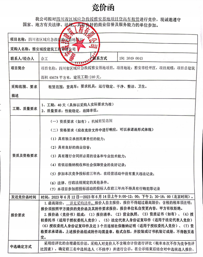 四川省區(qū)域應(yīng)急救援雅安基地項(xiàng)目登高車租賃競價(jià)公告