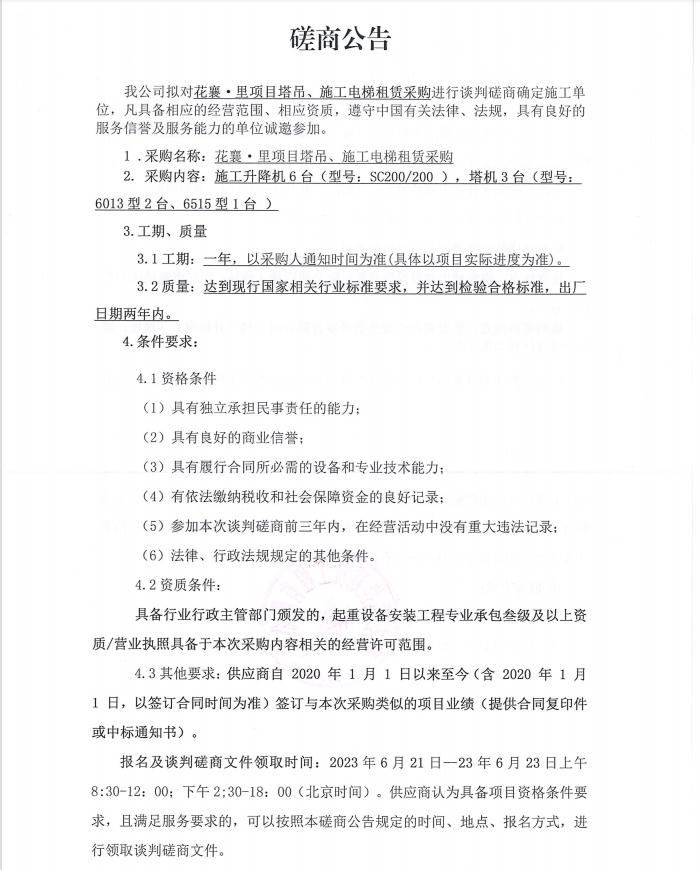 花襄·里項目塔吊、施工電梯租賃采購談判磋商公告
