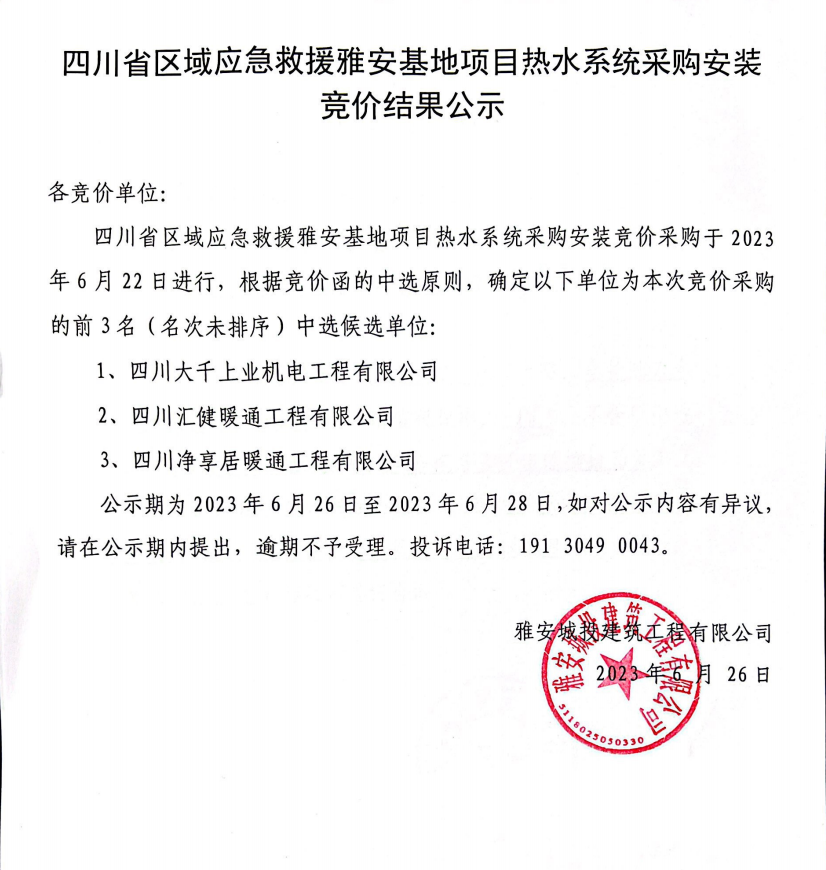 四川省區(qū)域應(yīng)急救援雅安基地項(xiàng)目熱水系統(tǒng)采購安裝競(jìng)價(jià)結(jié)果公示