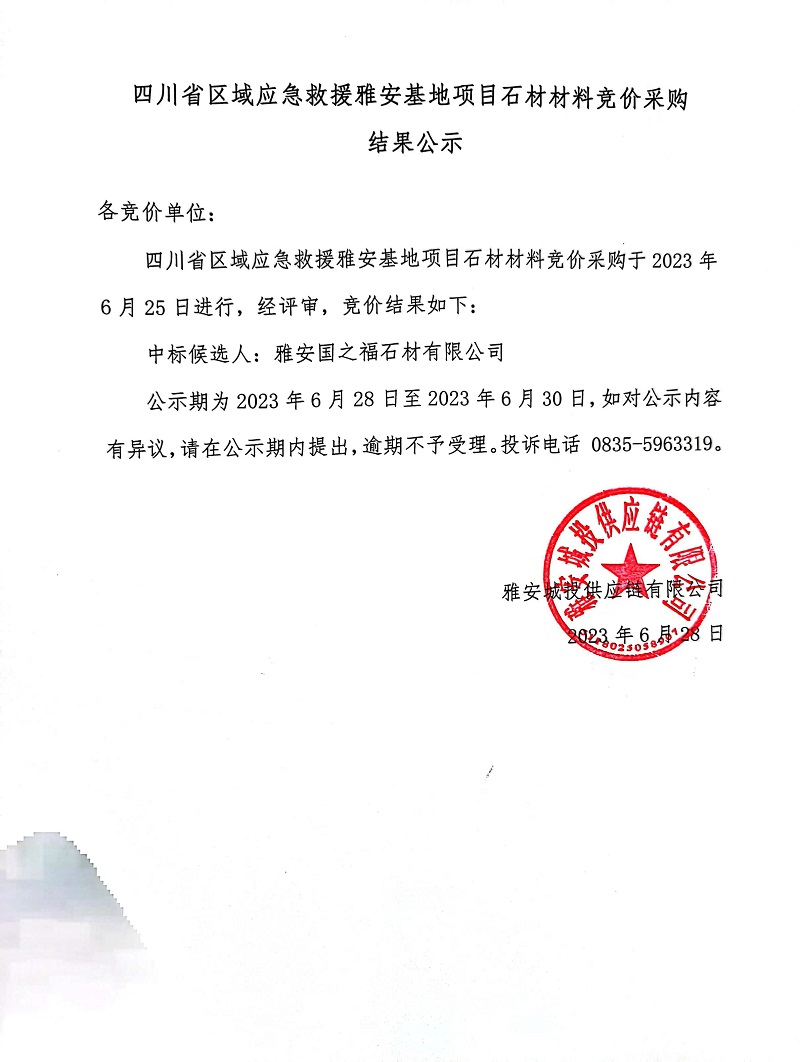 四川省區(qū)域應(yīng)急救援雅安基地項(xiàng)目石材材料競(jìng)價(jià)采購(gòu)結(jié)果公示