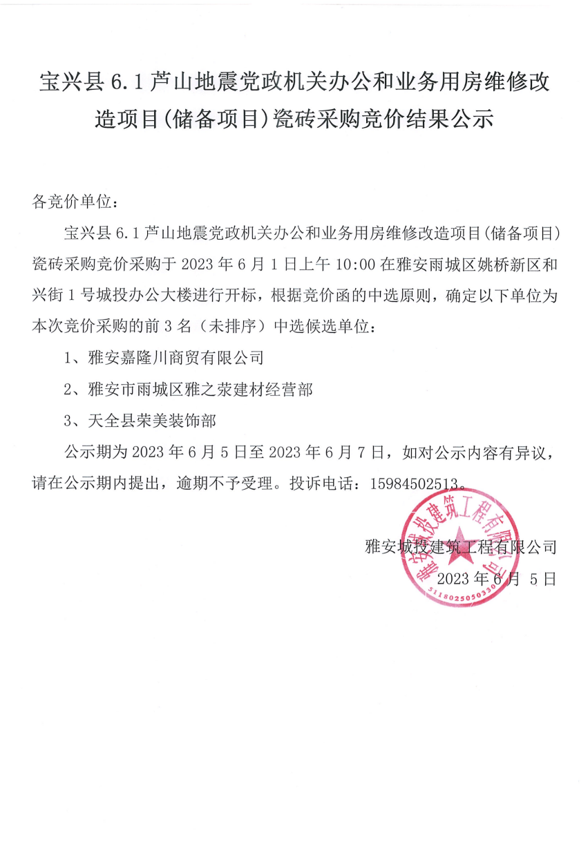 寶興縣6.1蘆山地震黨政機(jī)關(guān)辦公和業(yè)務(wù)用房維修改造項(xiàng)目(儲(chǔ)備項(xiàng)目)瓷磚采購競價(jià)結(jié)果公示