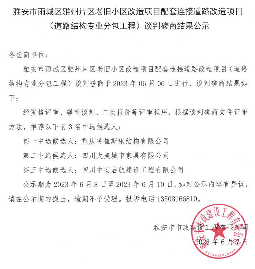 雅安市雨城區(qū)雅州片區(qū)老舊小區(qū)改造項(xiàng)目配套連接道路改造項(xiàng)目(道路結(jié)構(gòu)專業(yè)分包工程)談判磋商結(jié)果公示