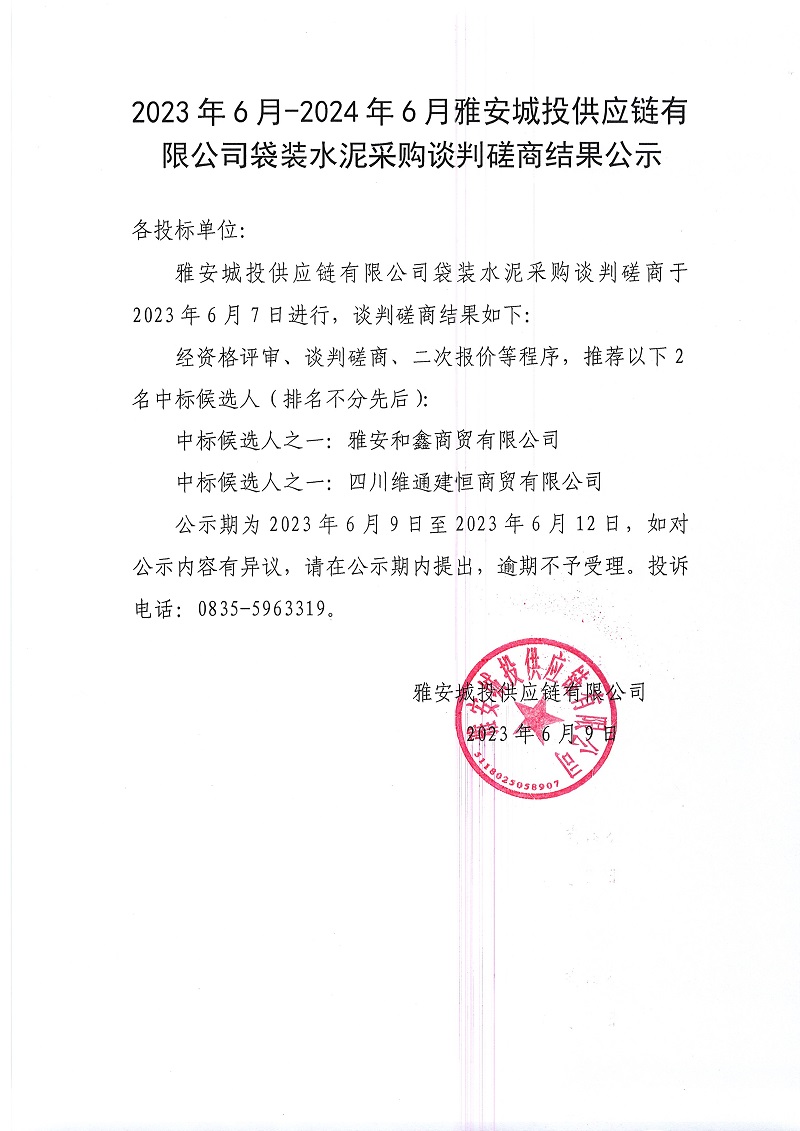 2023年6月-2024年6月雅安城投供應鏈有限公司袋裝水泥采購談判磋商結果公示