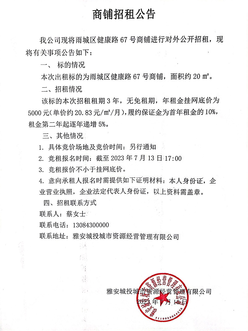 雨城區(qū)健康路67號商鋪招租公告