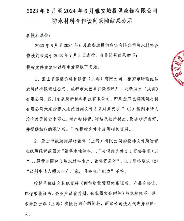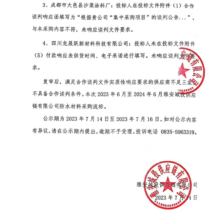2023年6月至2024年6月雅安城投供應鏈有限公司防水材料合作談判采購結果公示