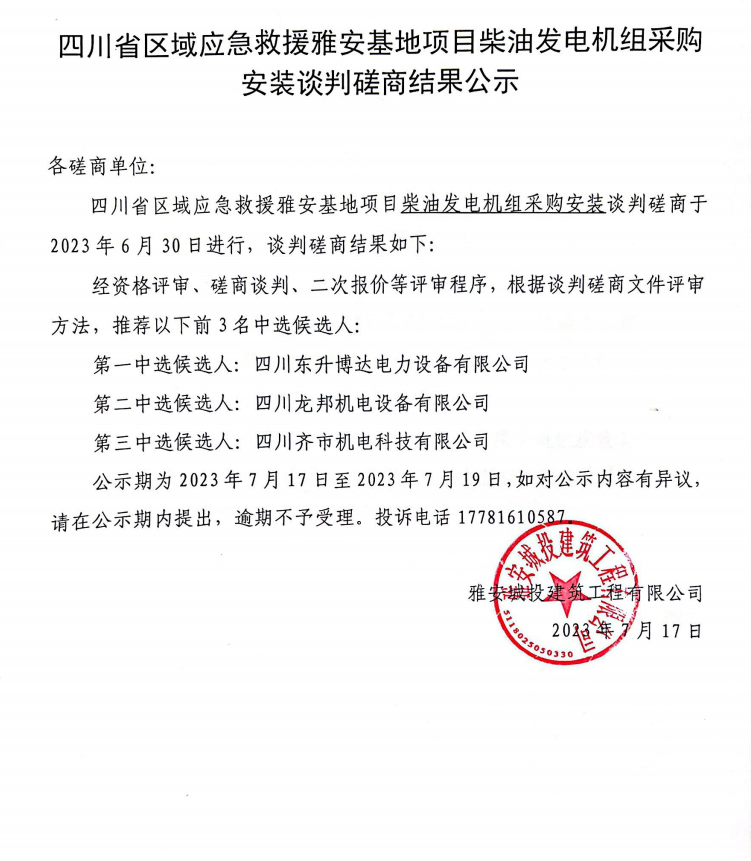 四川省區(qū)域應(yīng)急救援雅安基地項目柴油發(fā)電機組采購安裝談判磋商結(jié)果公示