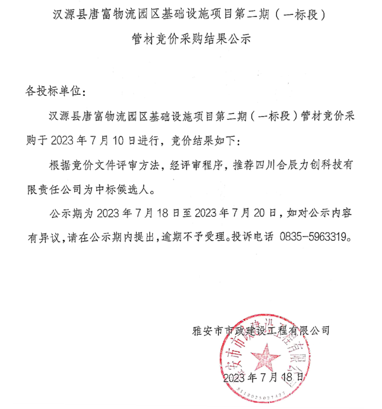 漢源縣唐富物流園區(qū)基礎(chǔ)設(shè)施項(xiàng)目二期(一標(biāo)段)管材競價采購結(jié)果公示