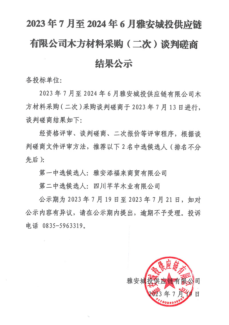 2023年7月至2024年6月雅安城投供應(yīng)鏈有限公司木方材料采購(二次)談判磋商結(jié)果公示