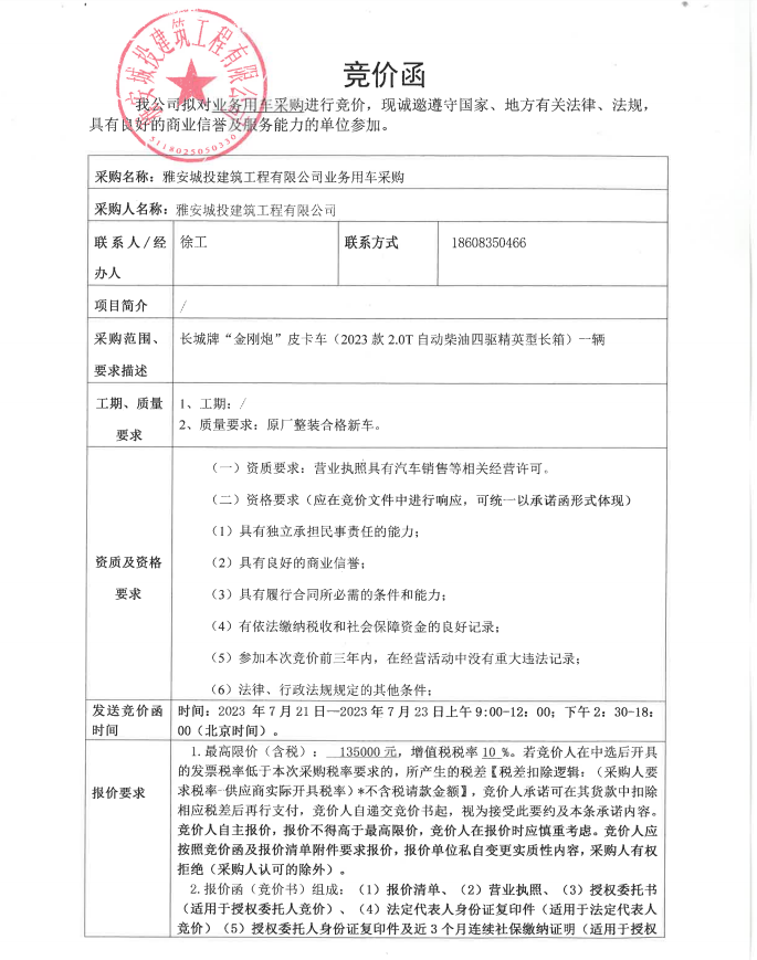 雅安城投建筑工程有限公司業(yè)務(wù)用車采購競價(jià)公告