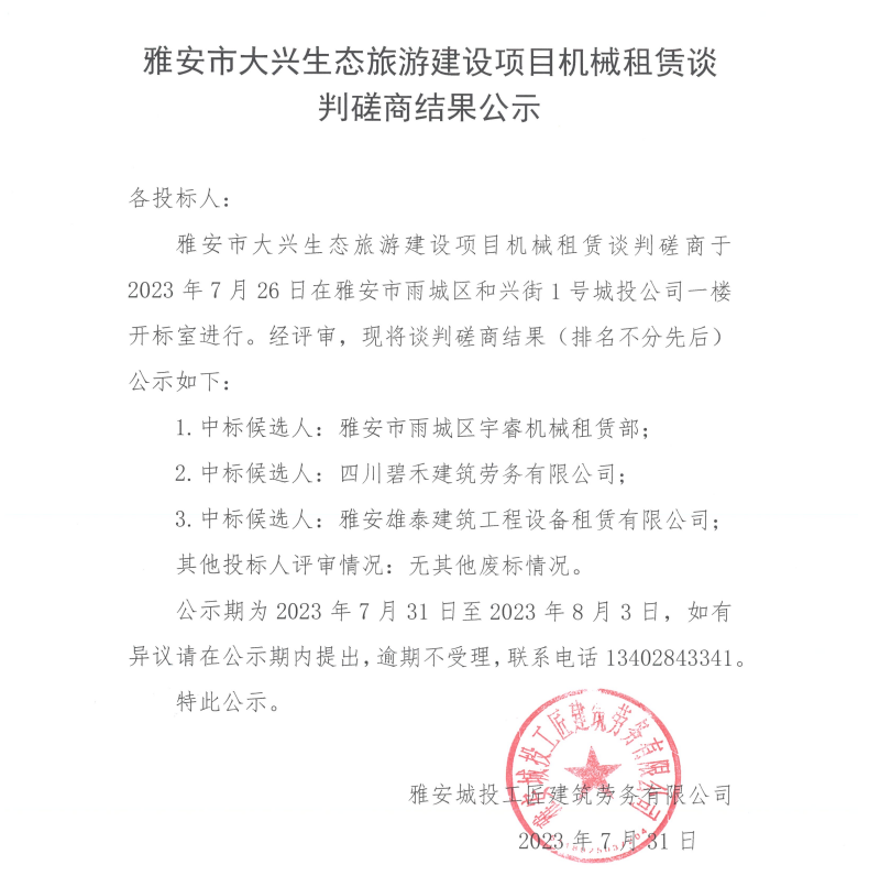 雅安市大興生態(tài)旅游建設(shè)項目機(jī)械租賃談判磋商結(jié)果公示