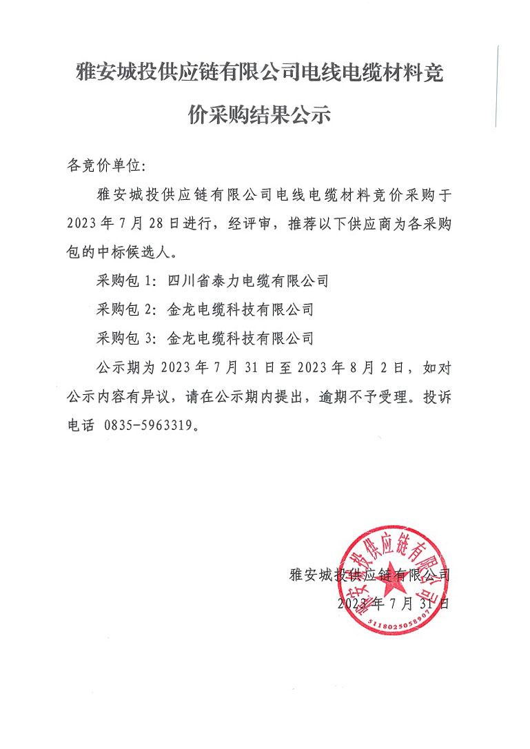 雅安城投供應(yīng)鏈有限公司電線(xiàn)電纜材料競(jìng)價(jià)采購(gòu)結(jié)果公示