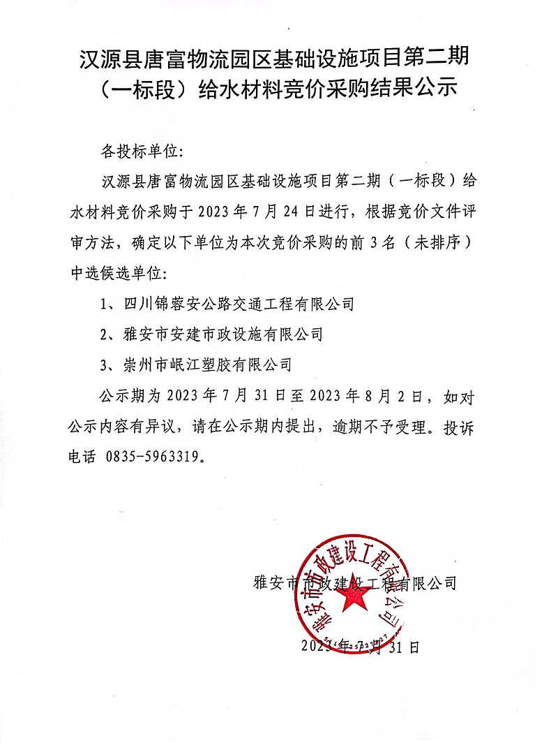 漢源縣唐富物流園區(qū)基礎(chǔ)設(shè)施項目第二期(一標(biāo)段)給水材料競價采購結(jié)果公示