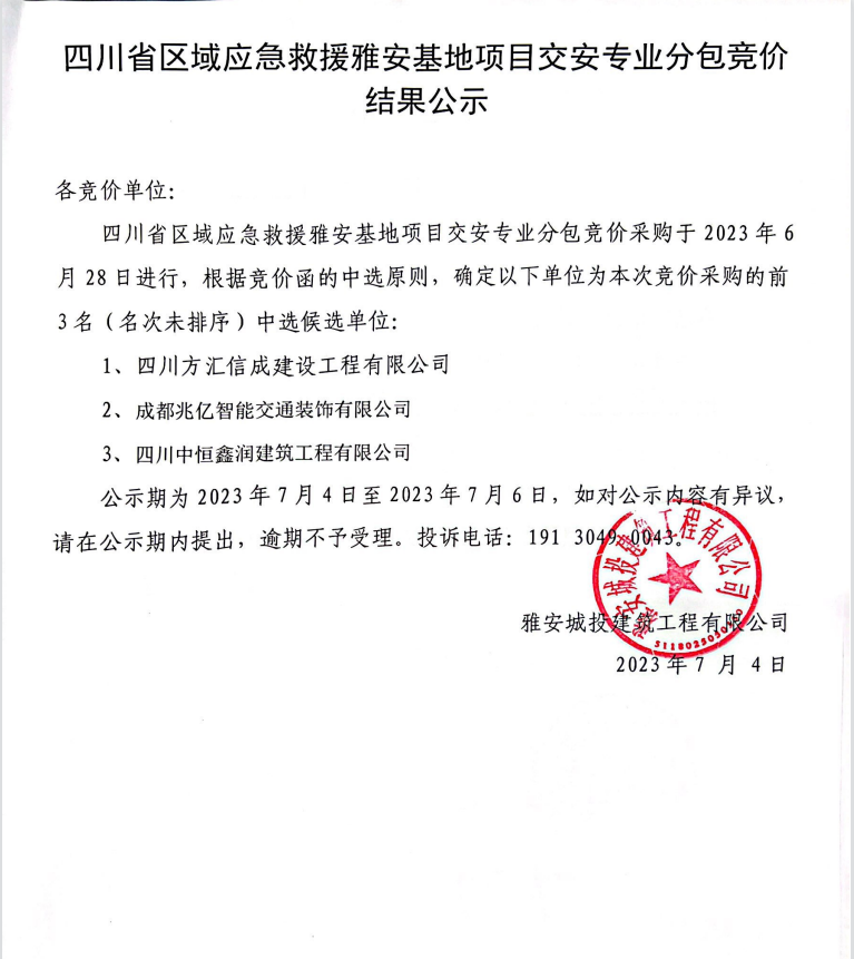 四川省區(qū)域應(yīng)急救援雅安基地項目交安專業(yè)分包競價結(jié)果公示