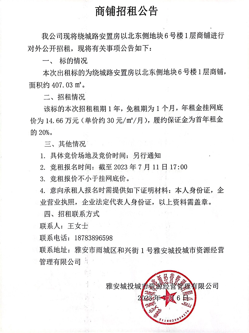 繞城路安置房以北東側(cè)地塊6號(hào)樓1層商鋪招租公告