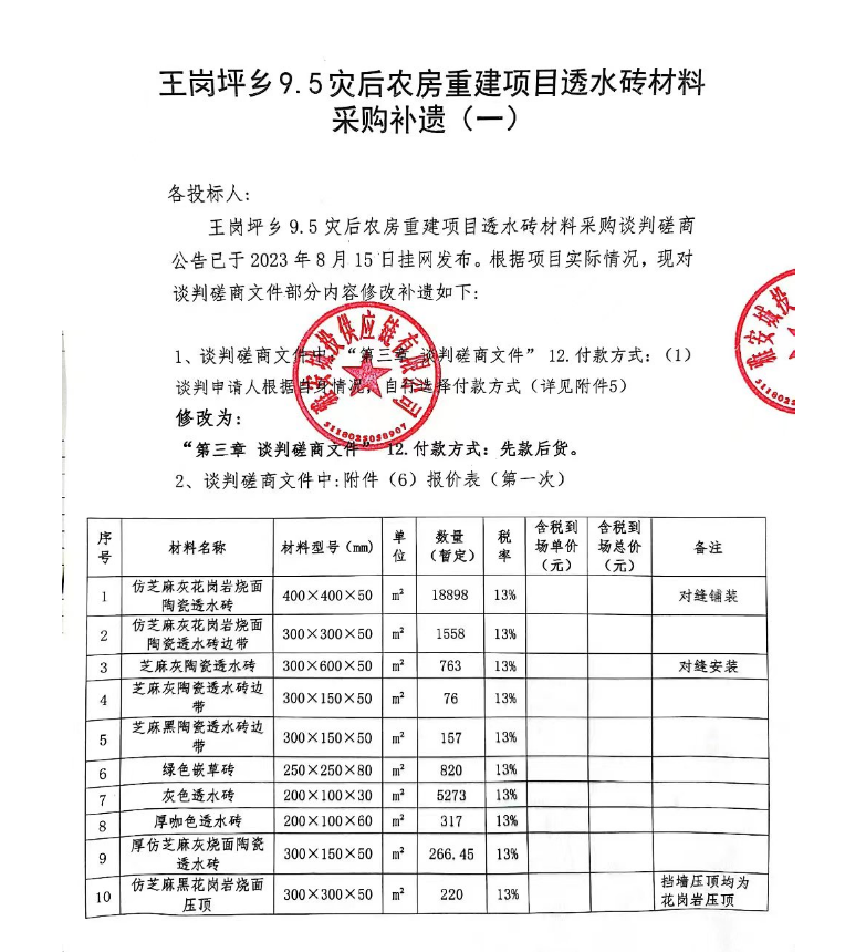 王崗坪鄉(xiāng)9.5災(zāi)后農(nóng)房重建項(xiàng)目透水磚材料采購(gòu)補(bǔ)遺(一)