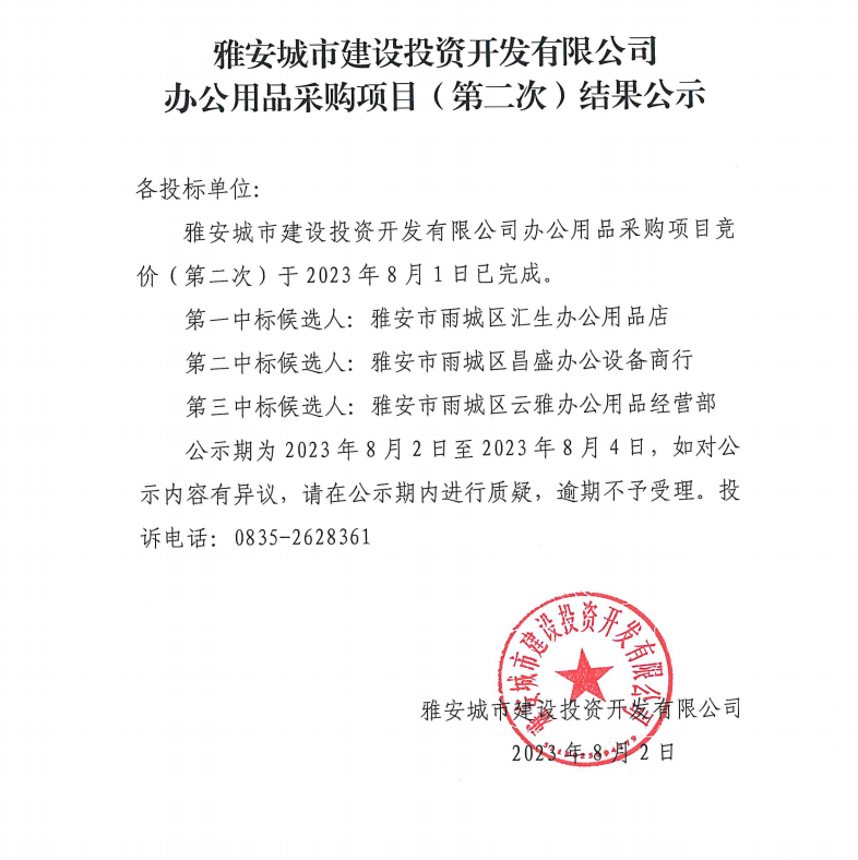 雅安城市建設(shè)投資開(kāi)發(fā)有限公司辦公用品采購(gòu)項(xiàng)目(第二次)結(jié)果公示