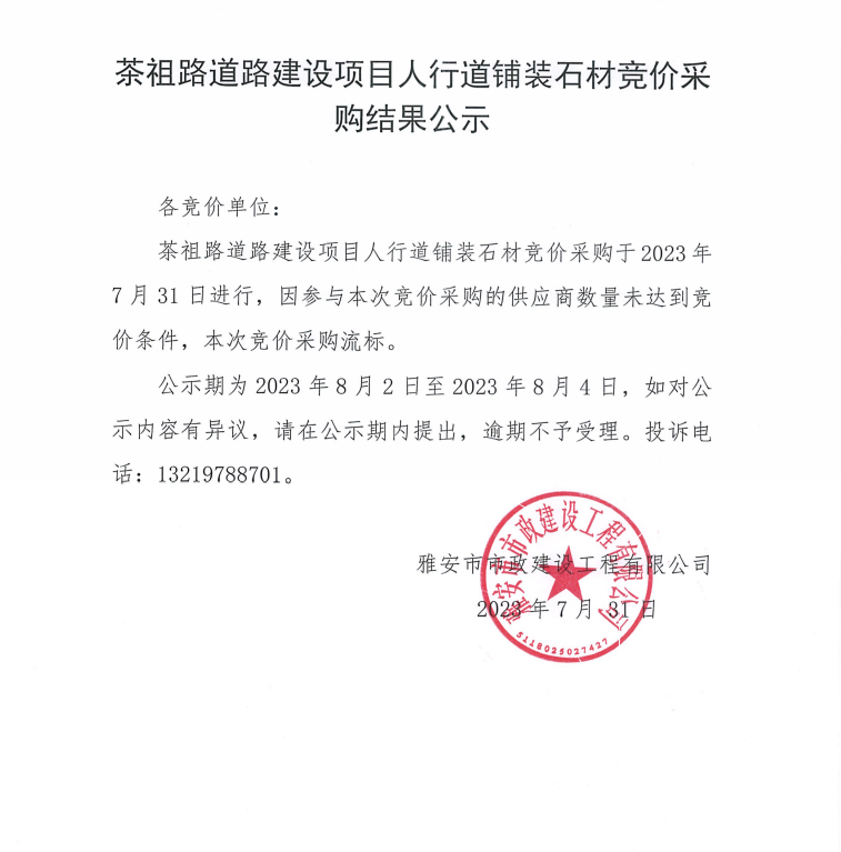 茶祖路道路建設(shè)項目人行道鋪裝石材競價采購結(jié)果公示