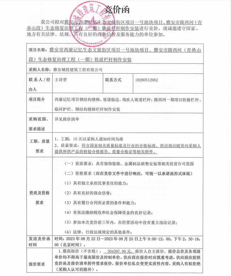 雅安市西康記憶生態(tài)文旅街區(qū)項(xiàng)目一號(hào)地塊項(xiàng)目、雅安市隴西河(青鼻山段)生態(tài)修復(fù)治理工程(一期)鐵質(zhì)欄桿制作安裝競(jìng)價(jià)公告