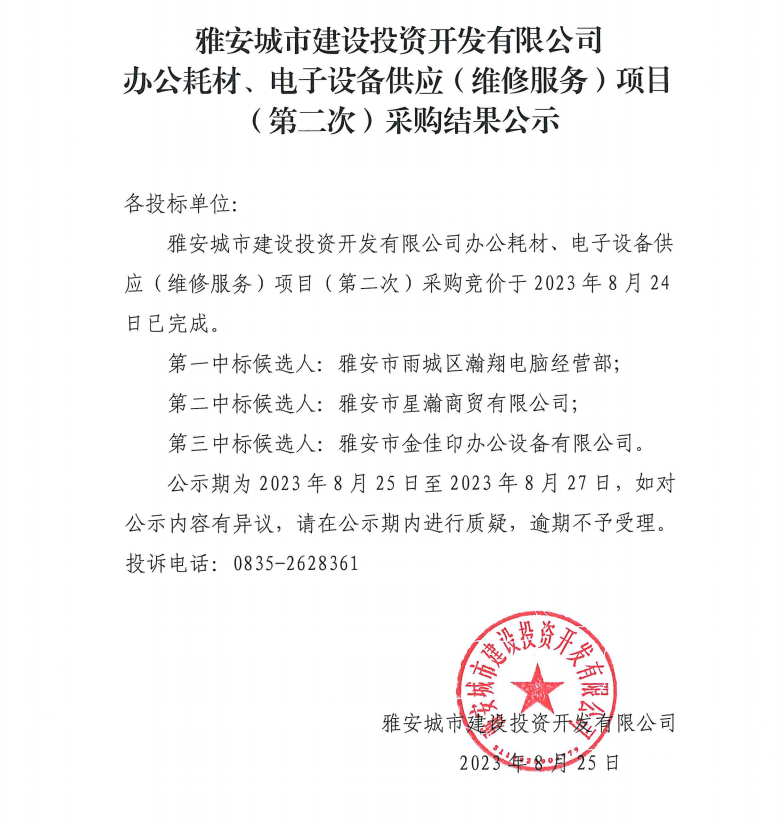 雅安城市建設(shè)投資開發(fā)有限公司辦公耗材、電子設(shè)備供應(yīng)(維修服務(wù))項目(第二次)采購結(jié)果公示