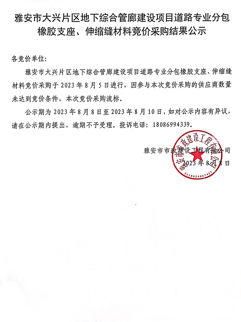 雅安市大興片區(qū)地下綜合管廊建設項目道路專業(yè)分包橡膠支座、伸縮縫材料競價采購結果公示