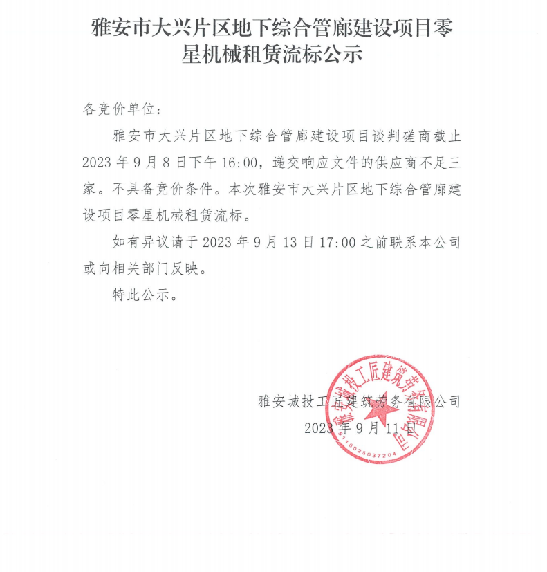 雅安市大興片區(qū)地下綜合管廊建設(shè)項(xiàng)目零星機(jī)械租賃流標(biāo)公示