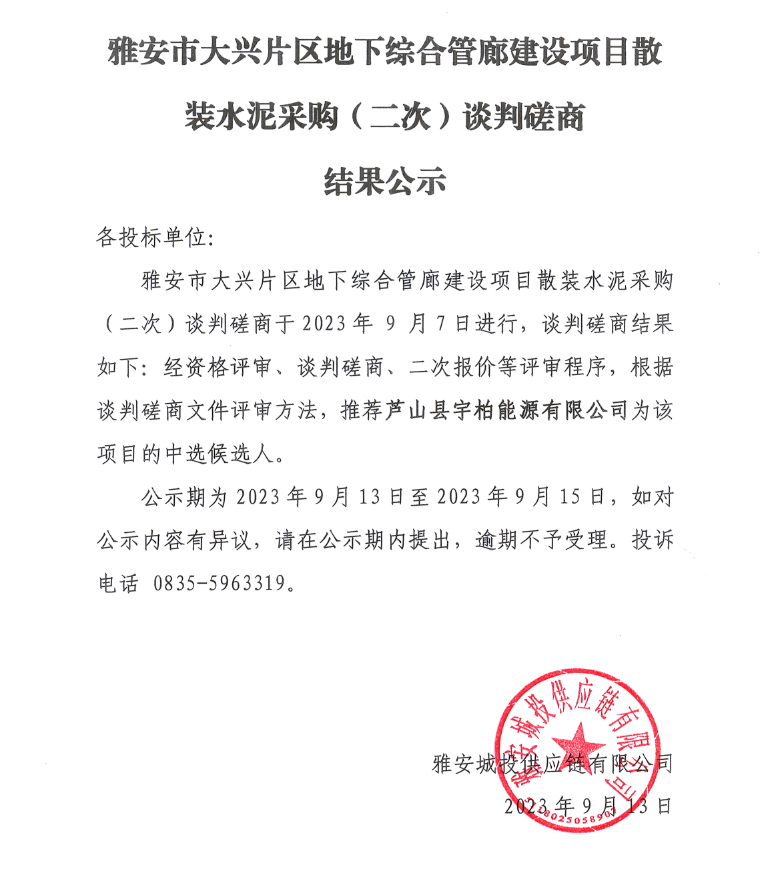 雅安市大興片區(qū)地下綜合管廊建設(shè)項(xiàng)目散裝水泥采購(二次)談判磋商結(jié)果公示