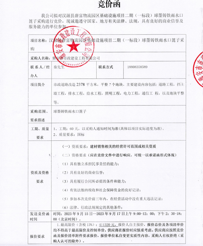 漢源縣唐富物流園區(qū)基礎(chǔ)設(shè)施項目二期(一標(biāo)段)球墨鑄鐵雨水口篦子采購競價公告