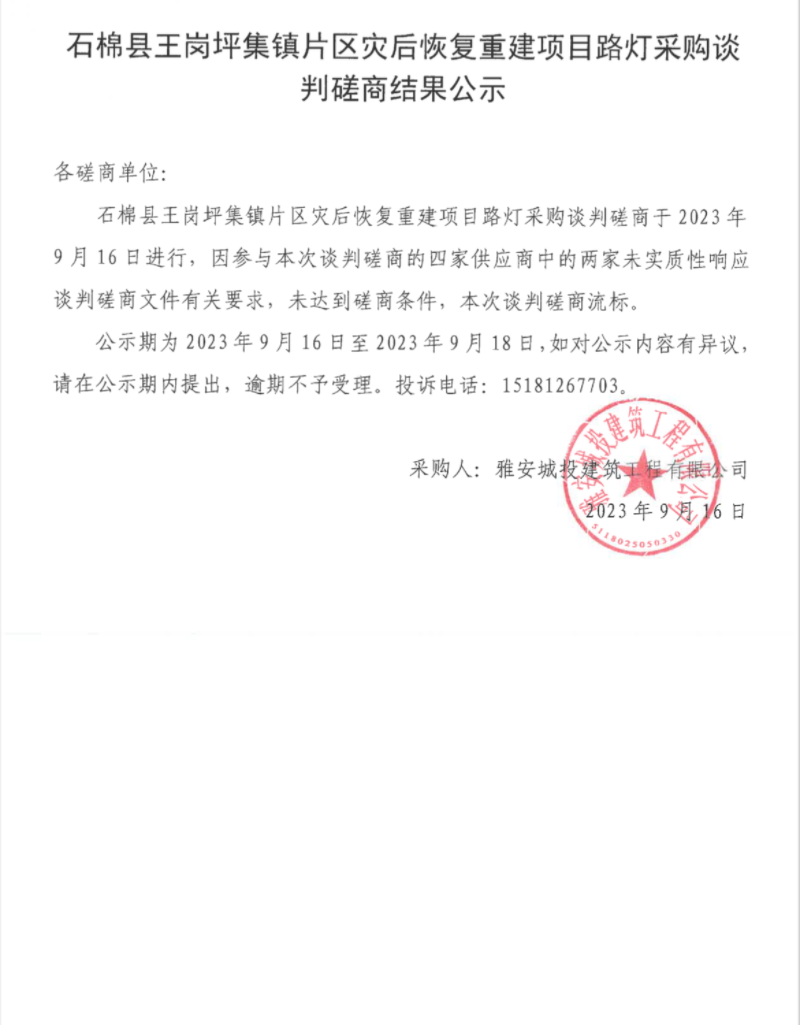 石棉縣王崗坪集鎮(zhèn)片區(qū)災(zāi)后恢復(fù)重建項(xiàng)目路燈采購(gòu)談判磋商結(jié)果公示