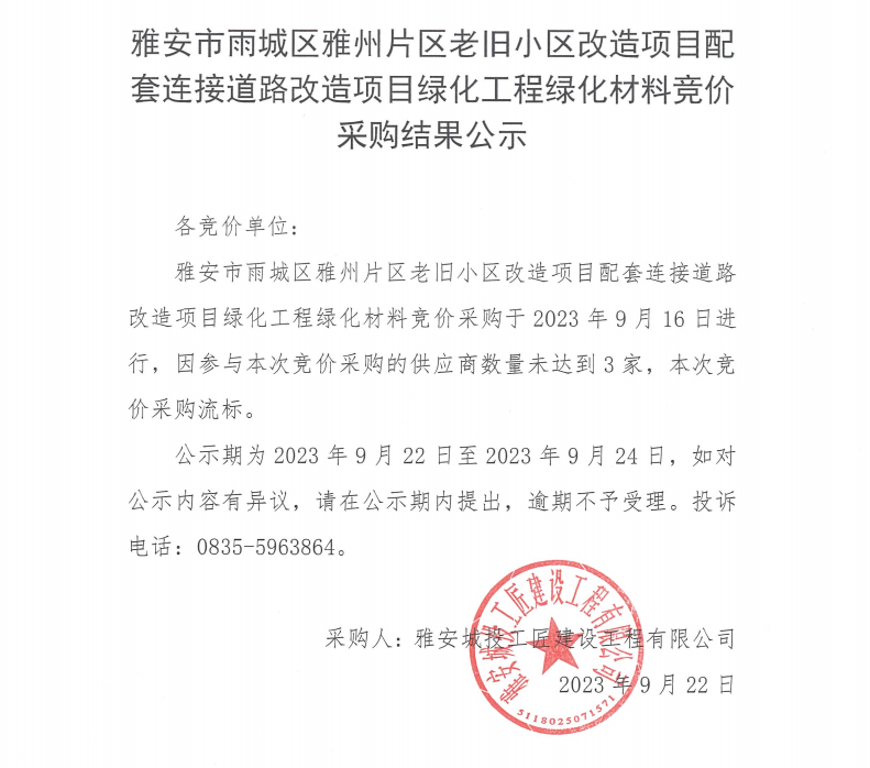 雅安市雨城區(qū)雅州片區(qū)老舊小區(qū)改造項目配套連接道路改造項目綠化工程綠化材料競價采購結(jié)果公示