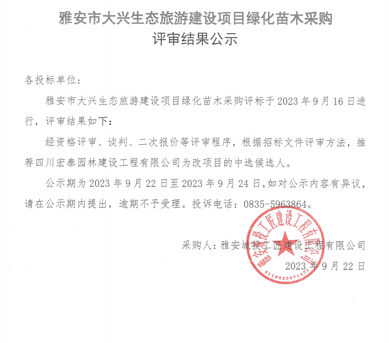 雅安市大興生態(tài)旅游建設項目綠化苗木采購評審結(jié)果公示
